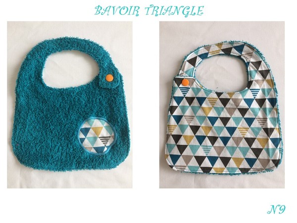 LE BAVOIR A UN COTE EN EPONGE BLEU TURQUOISE ET L' AUTRE COTE EN COTON A MOTIF TRIANGLE